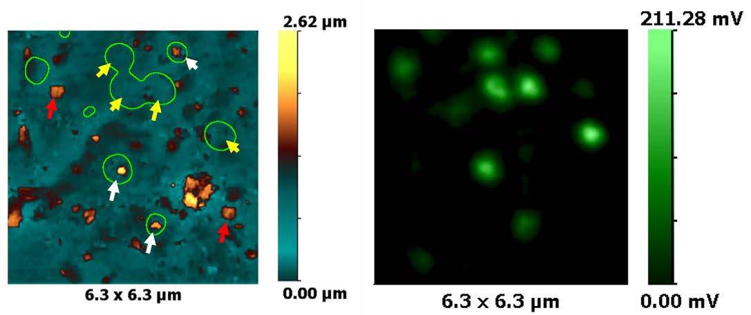 Spatially aligned topography, slope, and surface confocal images allows for precise localisation of nanoparticles on the surface cell membrane. This can be seen in the high resolution surface confocal images of 200nm red fluorescent nanoparticles on the surface of lung epithelial cells. A number of protrusions on the topographical image colocalise with red fluorescence spots indicating presence of nanoparticles on the surface. However, there are fluorescent spots (arrowheads) which do not correspond to a topographic protrusion on the surface of the cell, indicating that the nanoparticle has already been internalised. This information could not be deduced from a fluorescence image alone5. At the same time, not all topographic protrusions with dimensions similar to 200 nm sphere colocalise with fluorescence spots, indicating that topography alone also cannot serve as definite proof of nanoparticle presence on the surface.