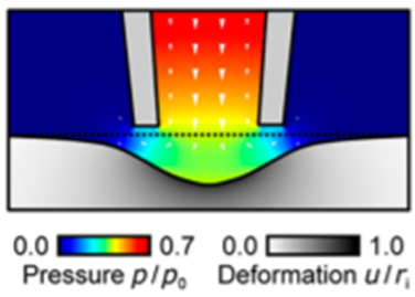 Applying a positive pressure to the tip of the pipette can be used to measure the nanomechanics of single cells through displacement of the sample surface. The mapping of cellular nanomechanics uses a constant pressure applied as the nanopipette as it moves across the cell, in a similar fashion to hopping mode in SICM. The cellular stiffness is measured in Young’s modulus11.