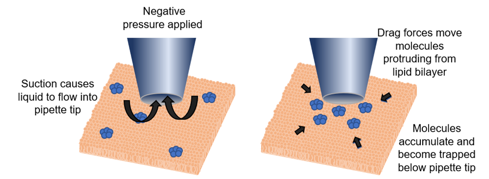 SICM has the ability to exert local pressure on a sample surface by applying pressure to the opening of the nanopipette. For example, application of negative pressure causes liquid to flow into the pipette tip and upon application of positive pressure, a local pressure builds up around the pipette causing the sample surface to indent. Applying a negative pressure to the nanopipette tip can be used in molecular nanomechanics whereby the negative pressure causes large molecules protruding from a lipid bilayer to move towards the pipette tip, where they become trapped. The trapping of molecules within the lipid bilayer allows for the investigation of local mobility and organisation of membrane-associated proteins.