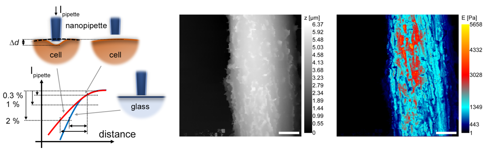 SICM offers a major advantage for measuring nanomechanics as, unlike other methods such as atomic force microscopy, the nanopipette does not make contact with the sample surface.